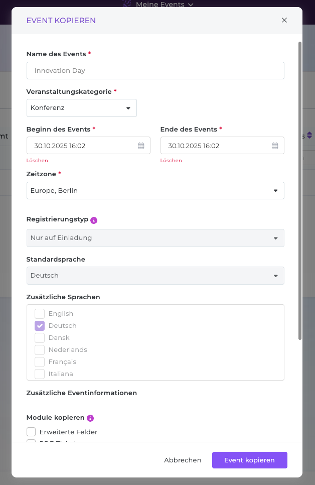 Hier können Sie bestimmte Optionen und Informationen aktualisieren und auswählen, welche spezifischen Bereiche des vorhandenen Events kopiert werden sollen.