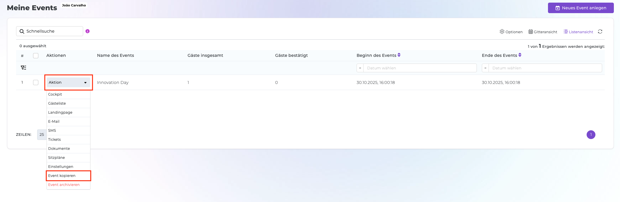 Um ein Event zu kopieren, navigieren Sie bitte zur Event Übersicht und wählen Sie das Aktion-Auswahlfeld aus. Dort finden Sie verschiedene Optionen, darunter auch die Möglichkeit Event kopieren.