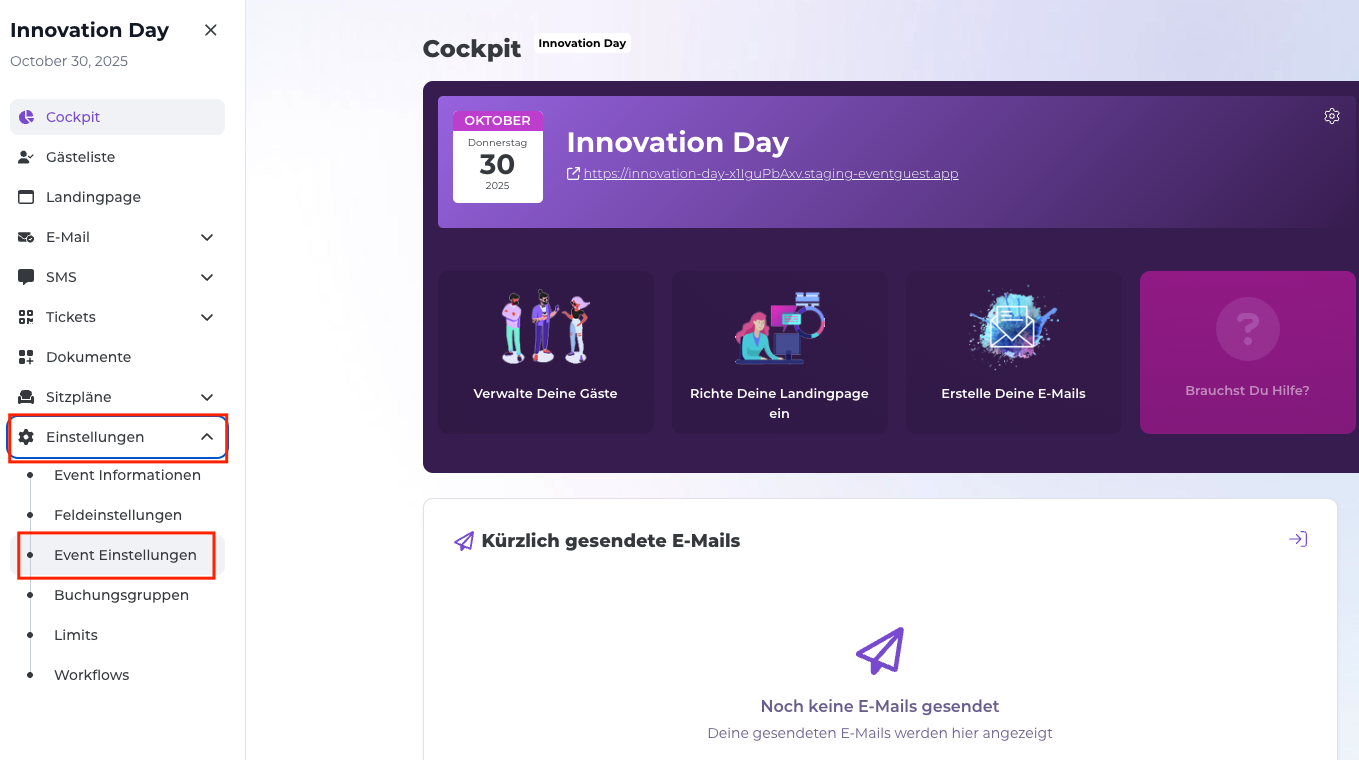 Die Zugriffskontrolle aktivieren Sie in den Einstellungen des jeweiligen Events. Öffnen Sie dazu die gewünschte Veranstaltung, klappen Sie die Sektion Einstellungen auf und wählen Sie im Dropdown-Menü den Punkt Event-Einstellungen aus.