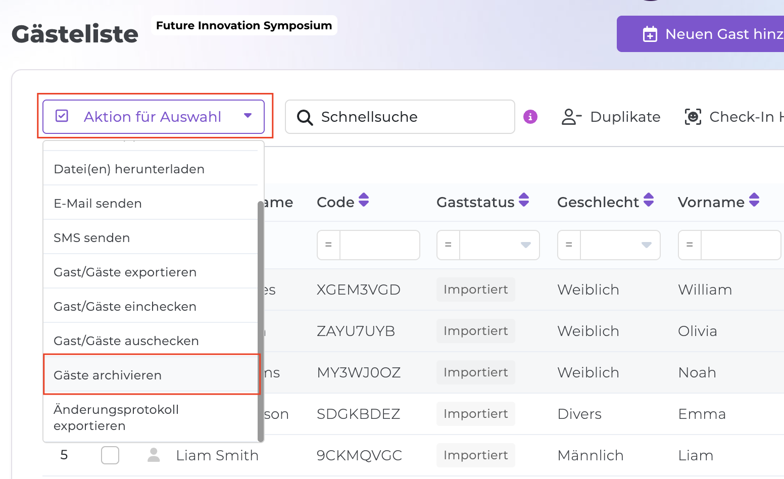 - Öffnen Sie das Menü Aktion für Auswahl oberhalb der Gästeliste