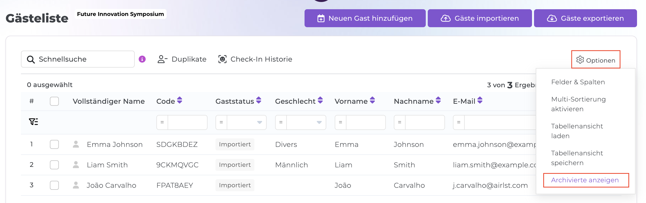 Um auf das Archiv zuzugreifen, klicken Sie in der rechten oberen Ecke der Gästeliste auf Optionen und anschließend auf Archivierte anzeigen.