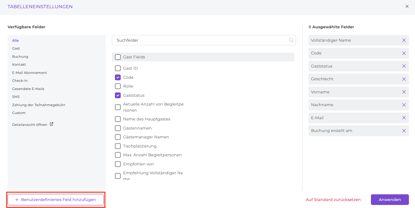 Wenn die vorhandenen Standardfelder nicht ausreichen, können Sie neue benutzerdefinierte Felder hinzufügen.