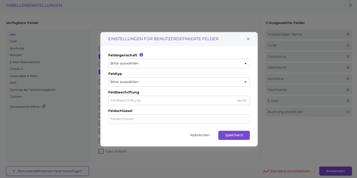 Mit benutzerdefinierten Feldern erfassen Sie individuelle Präferenzen oder weitere gästespezifische Informationen zu Ihrer Veranstaltung – beispielsweise Anreiseoptionen, Gruppenkategorien oder Catering-Präferenzen.