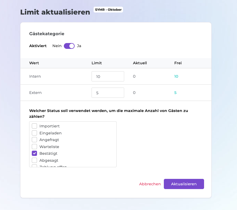Im unteren Bereich legen Sie fest, anhand welcher Gästestatus die verbleibende Kapazität berechnet wird.