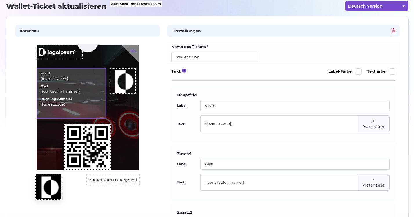 Ihr Wallet Ticket können Sie unter „Tickets & Add-Ons" -> "Ticket-Design" anpassen.