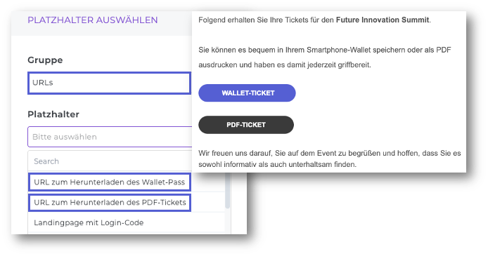 A new placeholder is now available, allowing you to insert individual download links for Wallet or PDF tickets directly into your email campaigns.